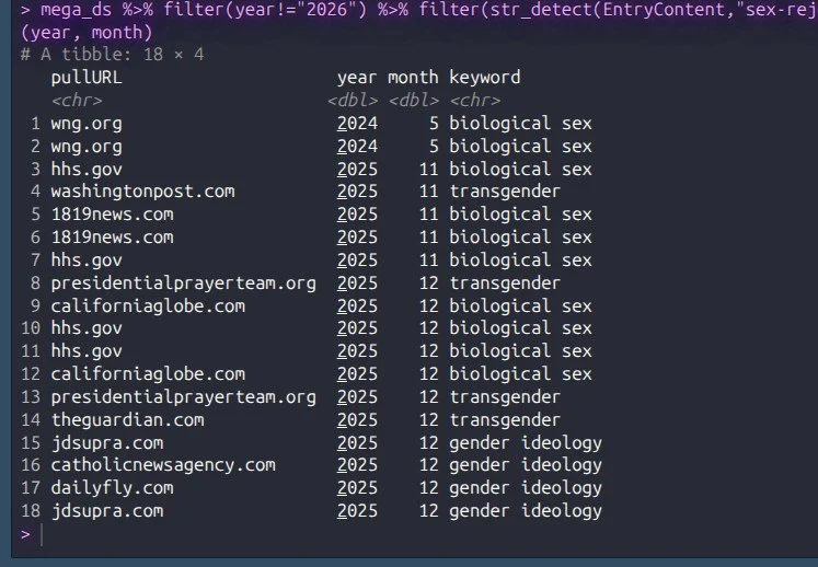 The day after the piece was published, Walter Bragman posted on Important Context a look into the origins of certain extremist terms that now make up the majority of federal language around gender-affirming care. Bragman note that the language of “sex-rejecting” which appeared in the past year in a series of executive orders and actions originated with the Ethics and Public Policy Center, a right-wing evangelical think tank which suggested the term in 2024 as an alternative to the accepted medical standard nomenclature of “gender-affirming”. Curious about this, I decided to run a quick query myself to see how this lined up with the news. The first hit, and only for 2024 for the Google News index is for May 2024, from the World News Group, an ultra-conservative news outlet. The page footer includes a “statement of faith” that makes their evangelical perspective quite explicit. These articles were released two days before the EPPC’s policy brief, to coincide with the launch. WNG’s article includes the stylized, bold pull-quote “gender-affirming care necessarily includes sex-rejecting harm.”