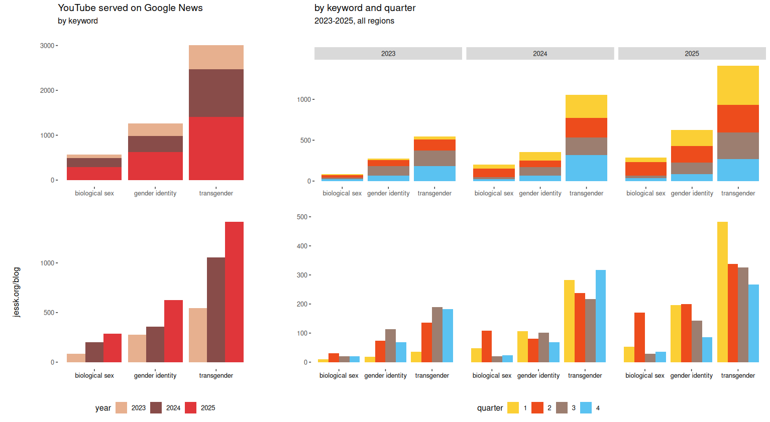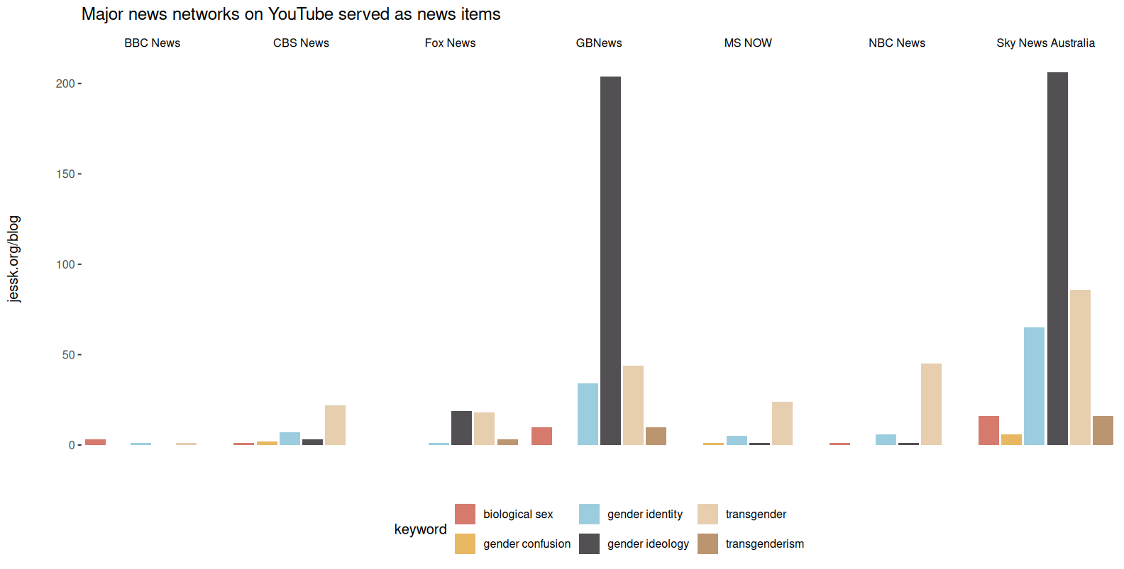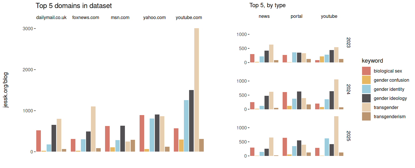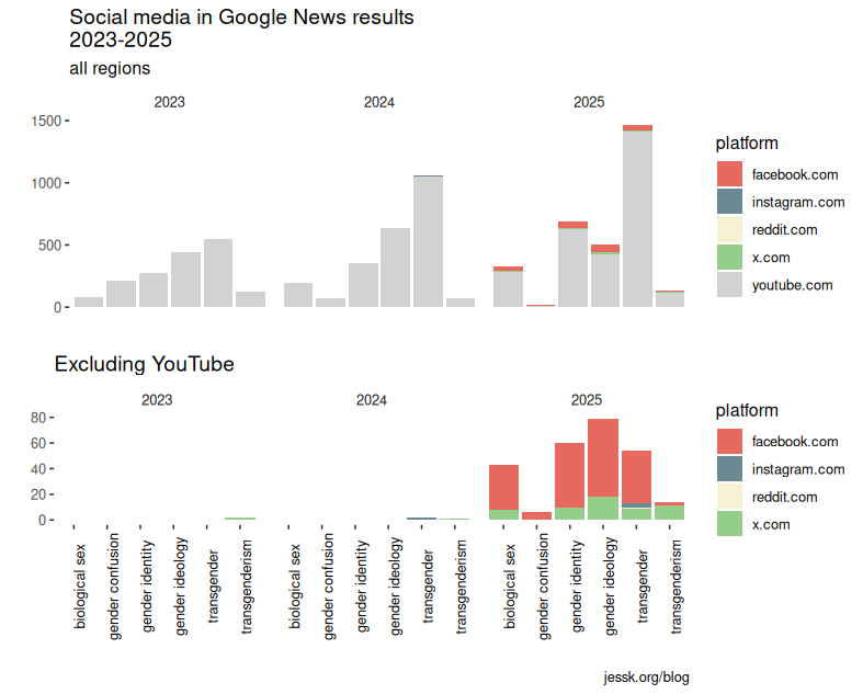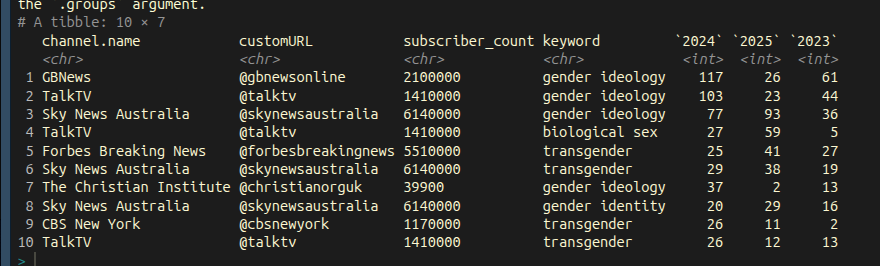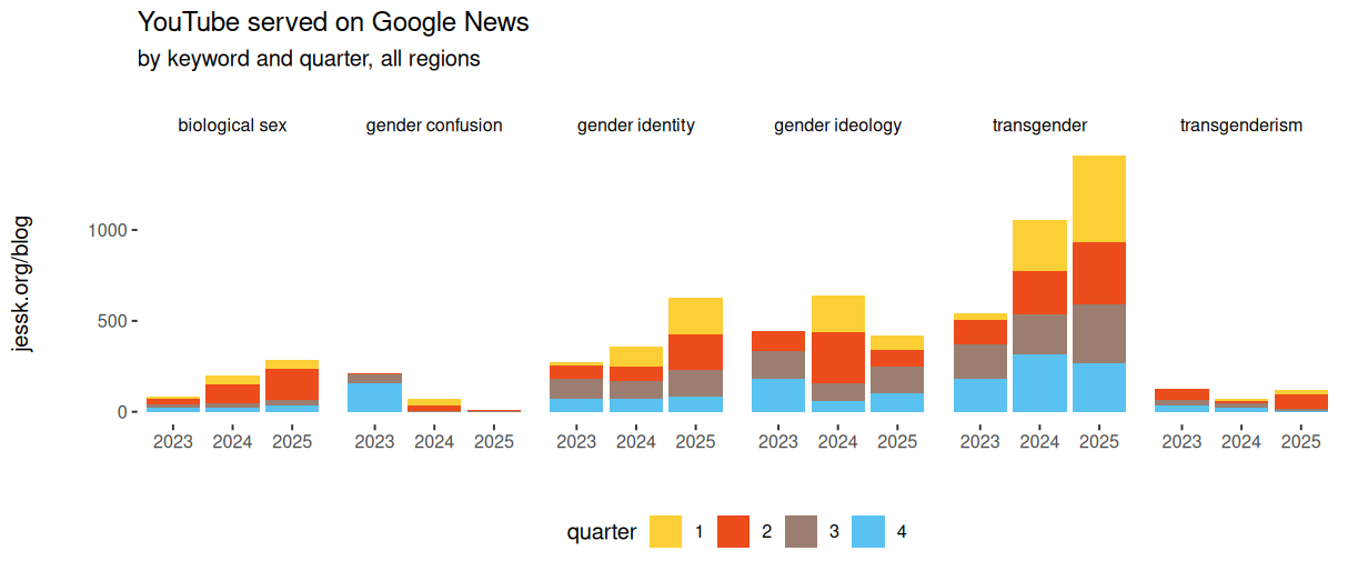 The inclusion of social media also brings with it a host of practices that haven’t been penalized quite as vigorously as search engine cheats. The TalkTV YouTube channel appears 147 times when restricting to the three major keywords (transgender, biological sex, and gender identity) of the original design. And there are certainly loads of anti-trans content, but many of these are false-positives. Below is an example of “description stuffing” where irrelevant information is added to the video description to reach a larger audience. While many of the channels are guilty of this, TalkTV is egregious even by YouTube standards. While it has been scrubbed from the video metadata, the scraper captured the description at the time of the initial post.