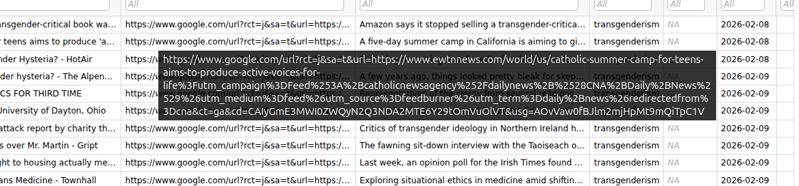 There are of course other consequences of using virality as an indicator of newsworthiness. Purely by accident while researching this installation in the series, I found a string of hits where a known exploit found its way into the index. The exploit, and the small crime spree in 2024 is explained here. What’s notable is that these were on the three main keywords, and used poached text from other sources., including an Xtra magazine on the Cass Review which appeared of all places on chicagocatholic.com. The article title is real, you can read the story here.