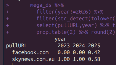Google News has also started to include all sorts of social media posts as of late. In fact, for corporations like SkyNews Australia, Facebook posts account for almost half of the entries in the index. This only started in 2025, and likely represents a shift in the company’s SEO strategy. As of today, entries from Sky News Australia are overwhelmingly Facebook posts rather than originating at the SkyNews website at a ratio of 67:6, or roughly 11x more frequently.