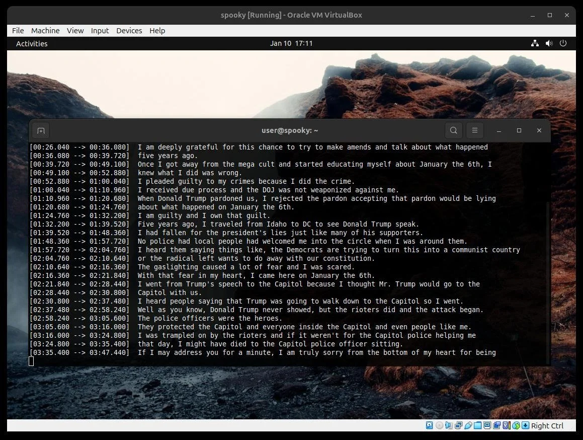 Using the above code: copy the location of the subtitles playlist URL and type “expsub” into a terminal. The text will automatically “expand” into the terminal with a complete transcript within a few seconds, depending on data transfer speeds.