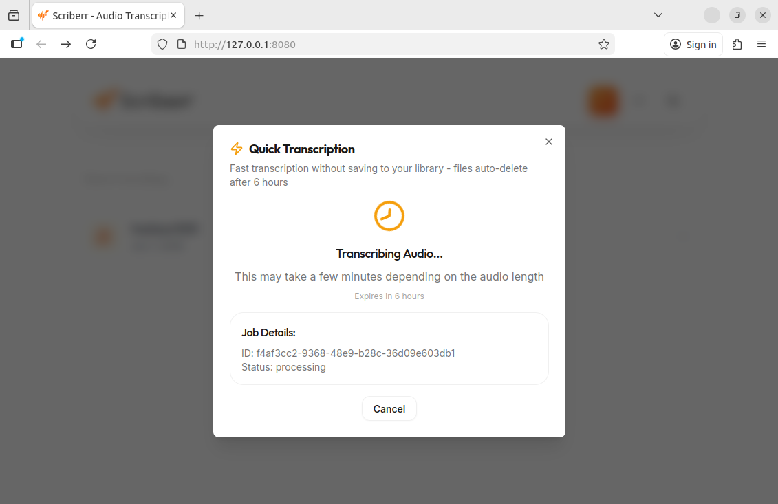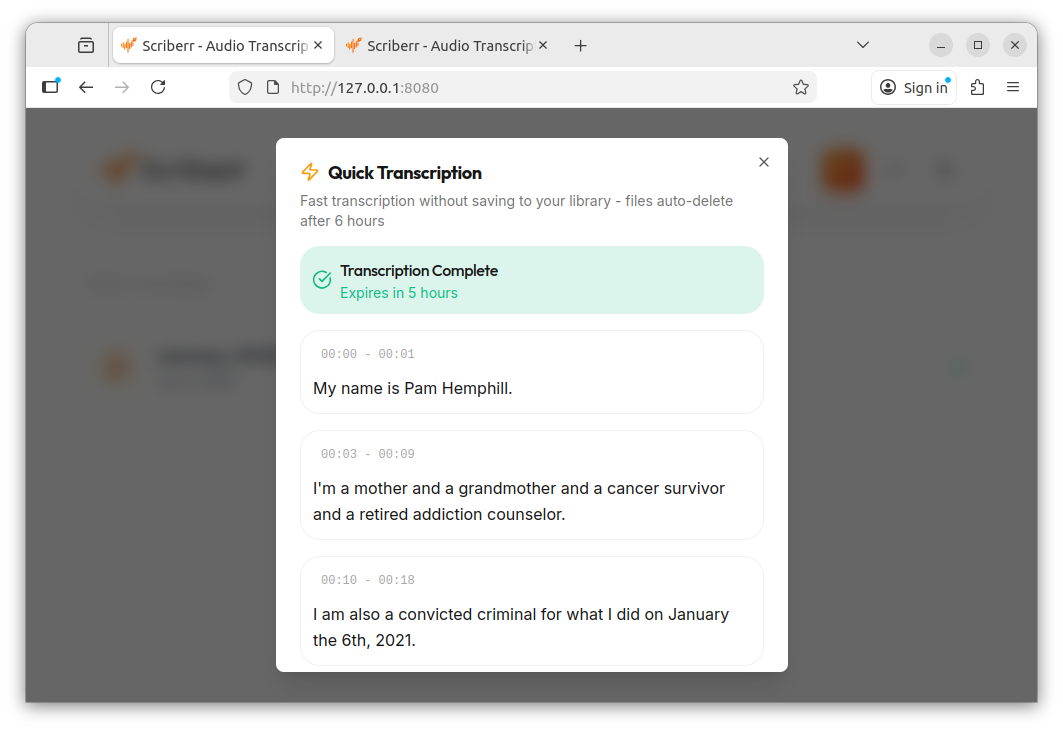 Scriberr “quick transcript” option running in VM