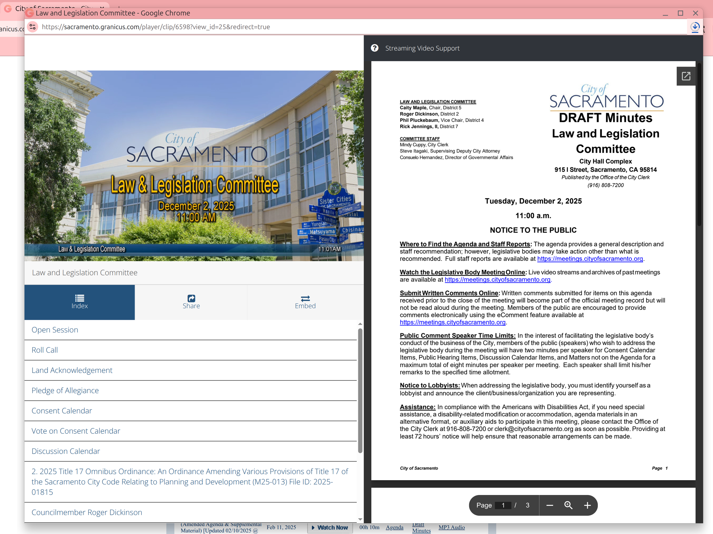Arguably the easiest to use is Granicus, used by cities like Sacramento and Clearwater. Since many Granicus implementations are hosted on the company domain, a google search can show you live examples here. As you can see, Granicus is extremely straightforward, and often displays a clear, easy to find “download” option. In the default view, hearings are shown next to handouts and the agenda, making it easy to follow along at home.